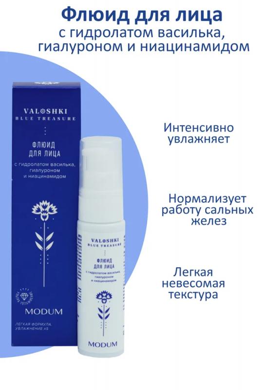 Крем для лица VALOSHKI c гидролатом василька, гиалуроном и ниацинамидом производства компании Модум из Беларуси. Флюид глубоко увлажняет удерживает влагу в коже, улучшает цвет кожи, защищает от высокоэнергетического синего света, заполняет мелкие морщинки. Дневной крем нормализует работу сальных желез, матирует кожу, подготавливает кожу к макияжу. Ниацинамид выравнивает цвет кожи и рельеф, защищаетот высокоэнергетического синего света и цифрового загрязнения. Гиалуроновая кислота интенсивно увлажняет, повышает тонус и эластичность, борется с возрастными изменениями. Пантенол успокаивает и ускоряет восстановительные процессы кожи. Гидролат василька убирает следы усталости, освежает и обладает антиоксидантным эффектом. Без силиконов, и парабенов, и минерального и масла, и красителей.