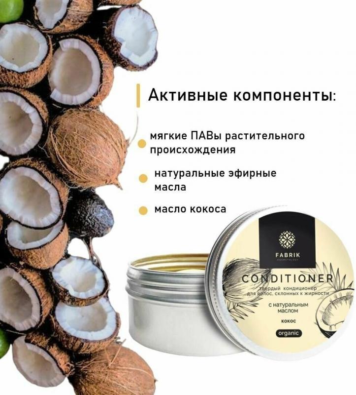 Натуральный твердый кондиционер предназначен для волос склонных к жирности. Содержащееся в составе бальзама масло кокоса имеет уникальный набор незаменимых жирных кислот улучшающий метаболизм и благотворно влияющих на красоту и здоровье волос и кожи. При регулярном использовании бальзама можно откорректировать повышенную выработку кожного сала, избавиться от перхоти и восстановить естественный блеск. Бальзам для волос облегчает расчесывание, защищает от термического воздействия и UV-лучей, обладает антистатическим эффектом