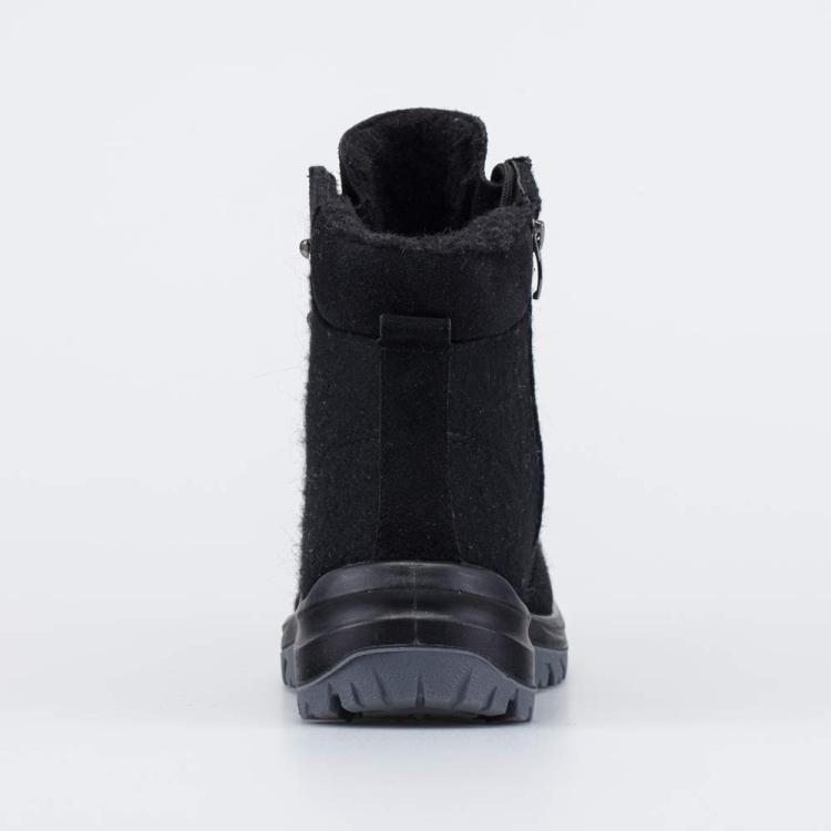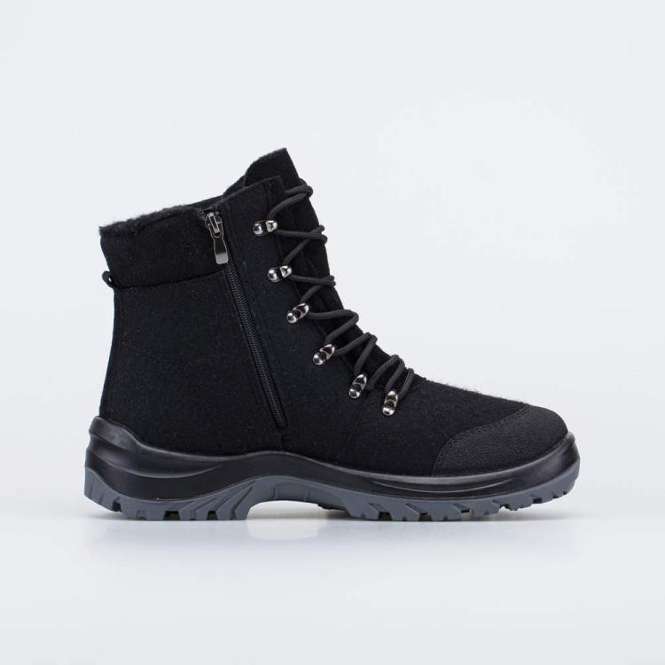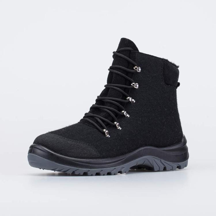Удобные черные валенки, стилизованные под высокие ботинки, соединяют в себе современный стиль и все преимущества обуви из натурального войлока. Войлок плотный, с водоотталкивающими свойствами. Он надежно сохраняет тепло, дышит и создаёт приятный микроклимат вокруг стопы. Антивандальная накладка на носочной части защищает ее от влаги, повреждений и реагентов. Эти теплые валенки имеют подкладку из шерстяного меха, которая обеспечивает дополнительную теплоизоляцию и комфорт даже в сильные морозы. Войлочная стелька снабжена петелькой, чтобы легко вынимать ее для проветривания. Шнурки подчеркивают концепцию ботинок из войлока и позволяют отрегулировать их по полноте и подъему стопы. Модная кроссовочная подошва из полиуретана обеспечивает легкость зимней обуви, а резиновая накладка на ходовой поверхности повышает ее устойчивость. Модель анатомически правильная: обеспечивает комфортную поддержку стоп в течение всего дня. Сделано в России, ТМ Гуслицкие.