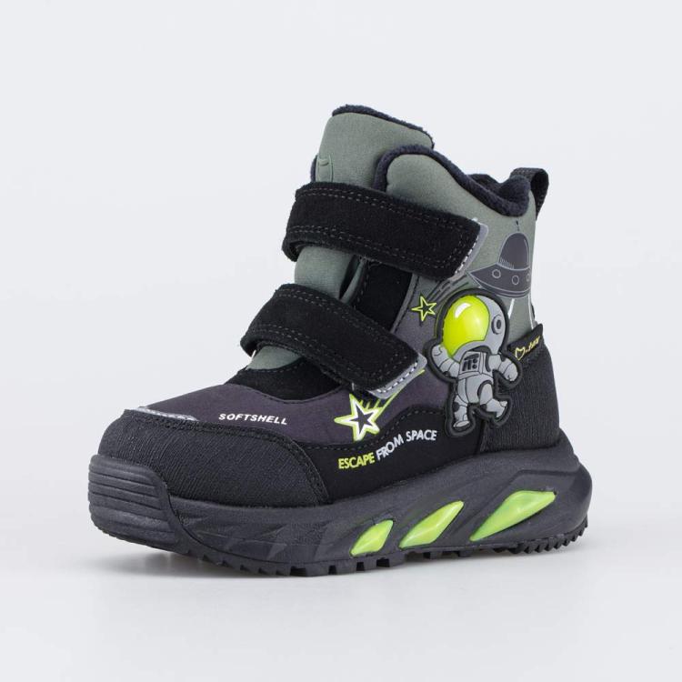 Зимние мембранные ботинки с софтшелл обеспечивают максимальный комфорт во время активного движения. Верх этих детских ботинок изготовлен из SoftShell – уникального материала с высокими ветрозащитными свойствами. Носок и пятка оснащены антивандальными накладками. Средний слой – мембрана k-tex, которая обеспечивает эффективное потоотведение, позволяя стопам дышать. Внутри подкладка из шерстяного меха и съемная войлочная стелька, которые надежно сохраняют тепло. Ботинки на липучках легко фиксируются на детских ножках, ребенку удобно обуваться самостоятельно. Гибкая подошва из легкого ЭВА обеспечивает хорошую амортизацию. Накладки из ТЭП повышают устойчивость зимней обуви. Элементы декора: - космический принт