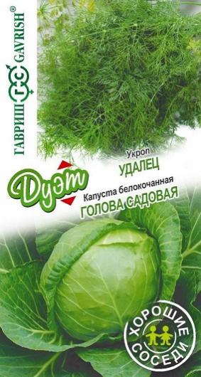 Капуста белокочанная Голова садовая: Скороспелый (85-100 дней) сорт. Рекомендован для использования в свежих салатах, приготовления щей, борщей в раннелетний период. Кочаны округлые, достаточно плотные, с короткой внутренней кочерыгой. Наружная окраска кочана бело-зеленая. Масса 1,4-1,8 кг. Укроп Удалец: Раннеспелый (30-35 дней до уборки зелени, 70-80 дней до уборки на специи) сорт. Розетка крупная, приподнятая, высотой 25-30 см. Листья зеленые с крупными сегментами. Зелень нежная, сочная, обладает высокой ароматичностью. Сорт характеризуется стабильной урожайностью, неприхотливостью. Фасовка 0,1г+2г