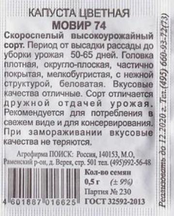 Скороспелый высокоурожайный сорт. Период от всходов до уборки урожая 85-95 дней. Головки округло-бугристые, массой 0,6-1,3 кг, белые, плотные, мелкозернистые. Вкусовые качества отличные. Сорт отличается дружной отдачей урожая. Рекомендуется для потребления в свежем виде и для консервирования. Фасовка 0,5г