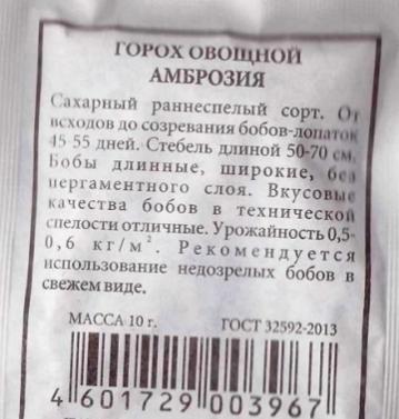 Среднепоздний (50-60 дней от полных всходов до начала сбора бобов) сахарный сорт. Боб прямой, с заостренной верхушкой, без пергаментного слоя, длинный (7-9 см). В каждом бобе завязывается 7-9 горошин. Стенки бобов толстые, мясистые, на вкус сладкие, без наличия жестких тканей. Это ценный диетический продукт богатый белками, сахарами, крахмалом, витаминами и каротином. Рекомендуется для употребления недозрелых бобов в свежем виде. Посев ранней весной на солнечной стороне участка,на глубину 4-6 см. Требуется подвязка. Сбор урожая - в июле-августе. Схема посева: 15x30 см.Урожайность 1,0-1,5 кг-м2. Фасовка 10г