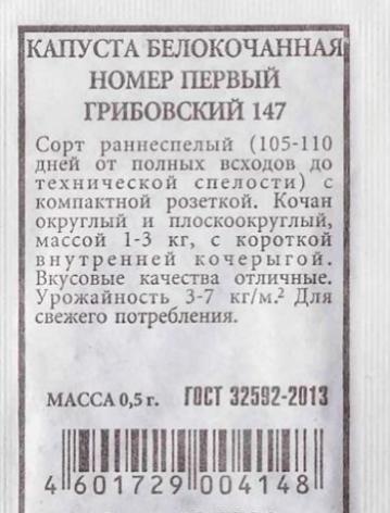 Среднеспелый (105-125 дней от полных всходов до технической спелости) сорт. Рекомендуется для квашения, приготовления щей, борщей, голубцов, тушения, начинки для пирогов. Посев на рассаду производят в начале апреля. Пикировку — в фазе семядолей. Высадка в грунт — в середине мая по схеме 50 х 60 см. Розетка листьев приподнятая. Кочан среднего размера, округлый, плотный, на разрезе беловатый. Наружная кочерыга средней длины, внутренняя - короткая. Масса кочана 1,4-3,8 кг. Вкусовые качества высокие. Рекомендован для непродолжительного хранения. Урожайность 4,9-8,0 кг-м2. Фасовка 0,5г
