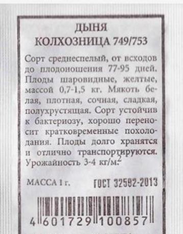 Сорт среднеспелый (77-95 дней от полных всходов до плодоношения). Растения длинноплетистые. Плоды шаро видные, массой 0,7-1,5 кг. Мякоть белая, плотная, сочная, сладкая, с прекрасным вкусом и ароматом. Сорт устойчив к бактериозу, хорошо переносит кратковременные похолодания. Плоды долго хранятся и отлично транспортируются. Урожайность 3-4 кг-м2. Фасовка 1г
