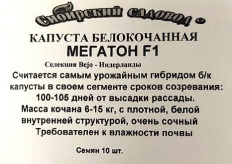 Считается самым урожайным гибридом б-к капусты в своем сегменте сроков созревания: 100-105 дней от высадки рассады. Масса кочана 6-15 кг, с плотной, белой внутренней структурой, очень сочный. Требователен к влажности почвы. Фасовка 10шт