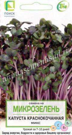Улучшает пищеварение. Тонизирует организм. Ростки капусты насыщенного фиолетового цвета обладают легким освежающим вкусом с пикантным послевкусием, сохраняя капустный аромат. Их добавляют в салаты, бутерброды, холодные закуски и омлеты. Микрозелень содержит огромное количество витаминов (С, Е, К, U) и минералов (К, Мg и Fe), углеводов, ферментов и фитонцидов. Высокое содержание витамина С и каротина повышает иммунитет, улучшает пищеварение и снижает кровяное давление. В состав входят семена капусты краснокочанной: Марс МС, Победа. Фасовка 5г