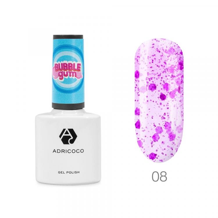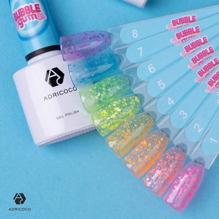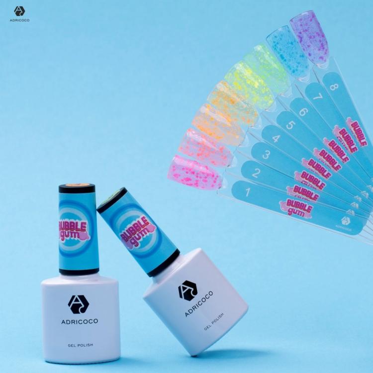 Коллекция гель-лаков ADRICOCO Bubble Gum состоит из 8 сочных цветов, которые смотрятся броско и стильно в качестве самостоятельного покрытия, а также могут стать нежным и красивым акцентом в нейл-арте. Каждый оттенок — это яркое сочетание цветного витражного фона и микса неоновой слюды. Гель-лак Bubble gum не требует нанесения базы, можно сразу наносить на ноготь