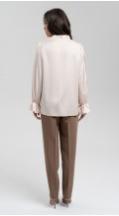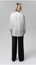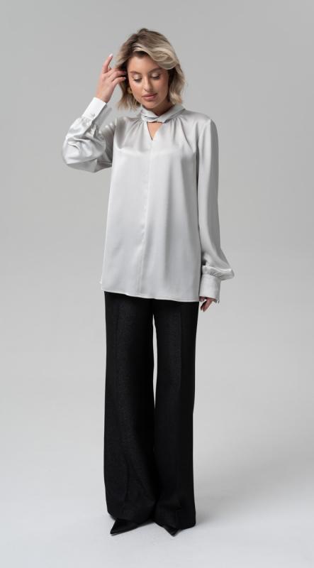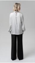 Блуза свободного кроя с оригинальной стойкой мягкой формы из струящейся ткани с деликатным блеском подойдет для любого повода — от праздничного ужина до деловой встречи. Втачной рукав полной длины на манжете. Застежка по спинке на две пуговицы и навесные петли.