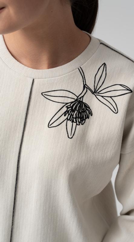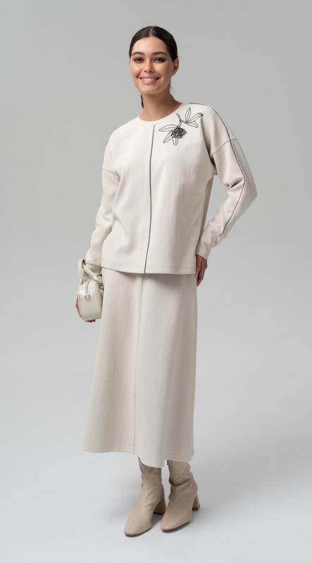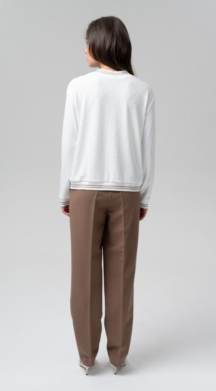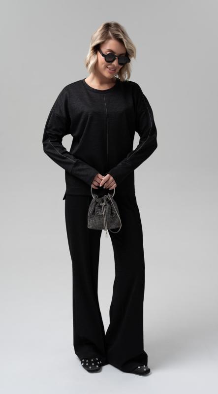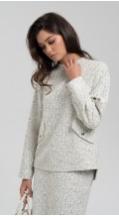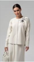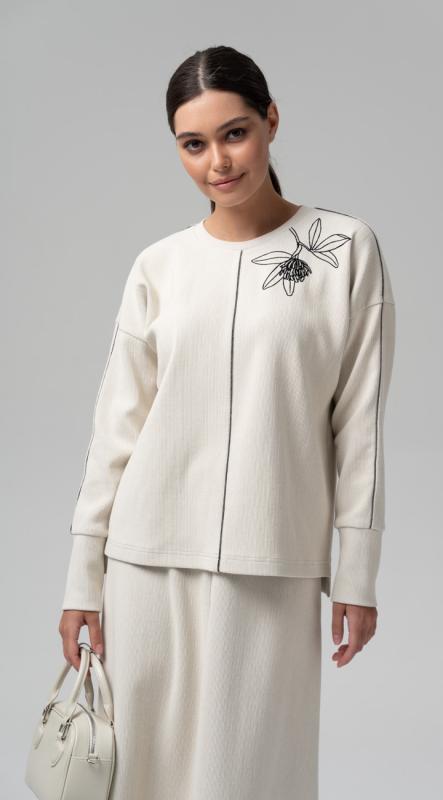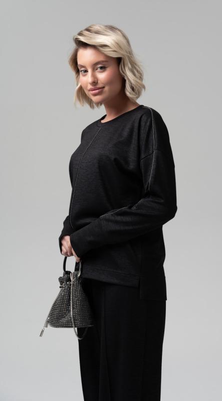 Стильная блуза свободного кроя из фактурного трикотажного полотна – легко впишется в осенне-зимний гардероб и позволит создавать образы в самых разных стилях. Рукава полной длины на притачной высокой манжете. Добавит настроения термотрансфер из объемного бархата на плече. Металлизированный кант в швах - визуально удлиняет силуэт, добавляя этой модели сверкающую ноту.