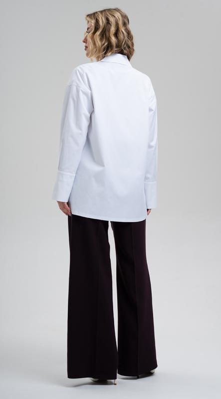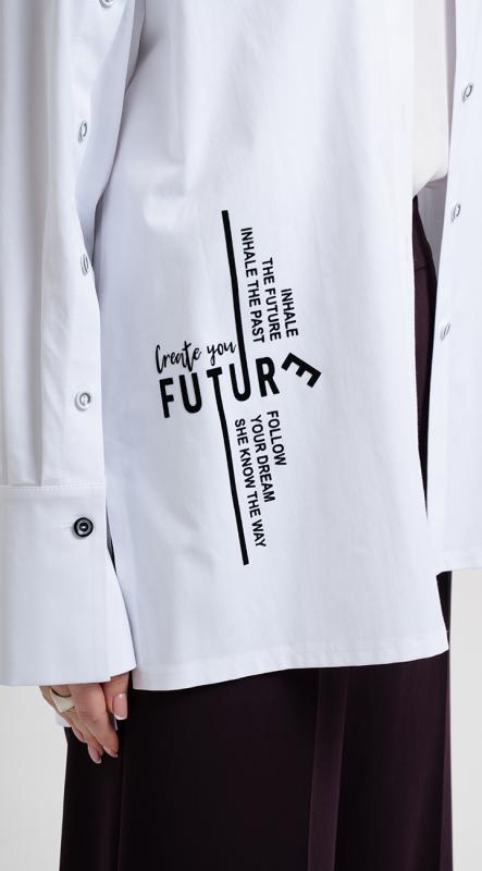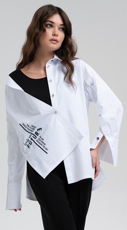 Белая рубашка с авторским принтом свободного силуэта со спущенной линией плеча и длинным рукавом на притачной манжете из хлопка - неотъемлемая часть любого базового гардероба. Рубашка эффектно дополнена разрезами на пуговицах на рукавах и функциональными разрезами по бокам, позволяющими разнообразить варианты ношения. А термотрансфер из черного бархата - без сомнения подарит ее обладательнице хорошее настроение на целый день. Застежка на петли и пуговицы.