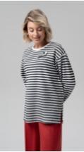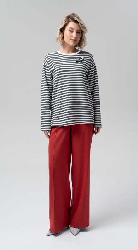 Лонгслив свободного кроя со спущенной линией плеча из трикотажного жаккарда в полоску - базовый предмет женского гардероба для создания ультрамодных многослойных образов. Комфортный рукав полной длины. В комплекте авторская брошь ручной работы.