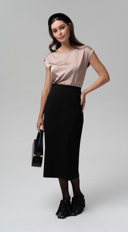 Прямая юбка-карандаш длиной midi с классической шлицей по задней половинке и на притачной поясе с резиной из трикотажного полотна - незаменимый элемент сезонного гардероба. Юбка на подкладе.