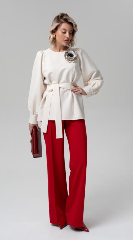 Стильная блуза свободного кроя из комфортной поливискозы - может стать фаворитом как нарядного гардероба, так и повседневных сэтов. Объемные фантазийные рукава полной длины на высокой манжете подчеркнут женственность и без всяких сомнений сделает ваш образ эффектным. Застежка по спинке на одну пуговицу и навесную петлю. Добавит хорошего настроения съемная авторская брошь.