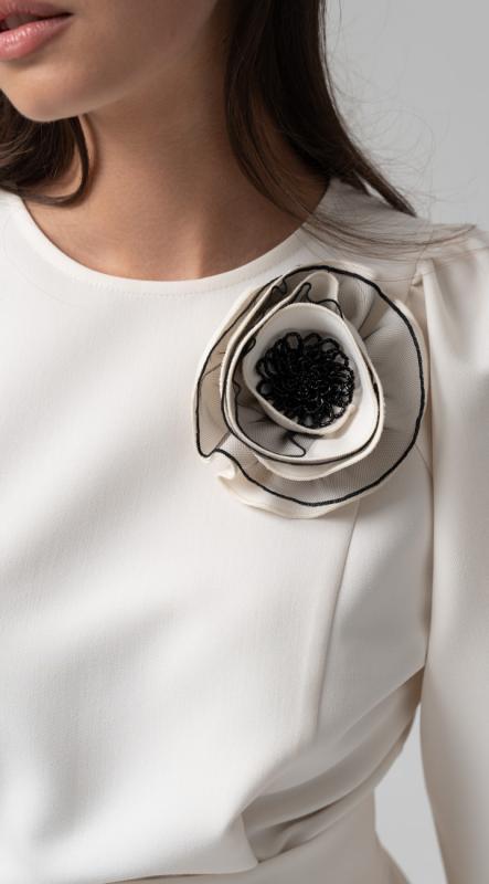 Блуза полуприлегающего кроя из трикотажного полотна - истинный образец элегантности и безупречного вкуса. V-образный вырез в сочетании с деликатной отделкой из сетки - визуально вытягивает силуэт, делая его стройнее. Рукав полной длины. Оригинальная брошь ручной работы добавит хорошего настроения.