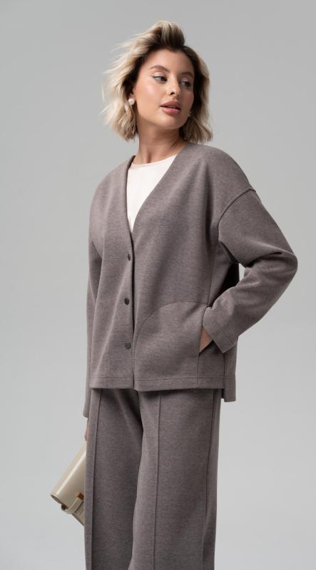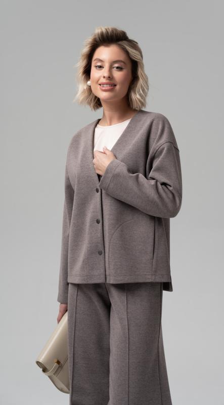 Жакет свободного покроя с V-вырезом горловины, со спущенной линией плеча из трикотажного полотна - может стать базовым атрибутом сезонного аутфита. Оригинальный крой делает его абсолютно комфортным и позволяет садиться на любую фигуру. Эффектная модель с застежкой на кнопки. Рукав полной длины. Добавит настроения авторская нашивка по спинке.