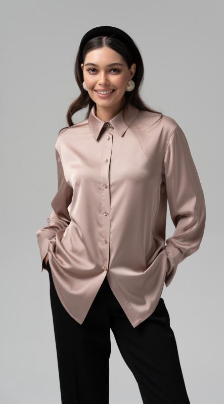 Базовая рубашка свободного силуэта из струящейся ткани с приглушенным блеском - стоит примерить лишь раз, и она станет вашей любимой вещью. Выверенный крой, комфортные линии, свободный рукав на притачной манжете и фигурный низ - вот составляющие успеха этого изделия. Застежка на петли и пуговицы.