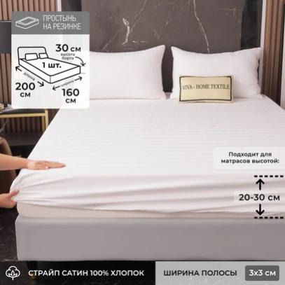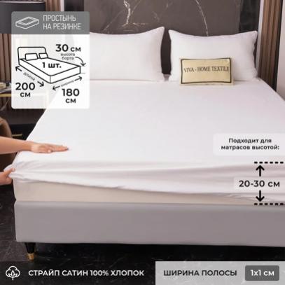 признак страйпа - чередование на ткани полос матовой и блестящей фактуры. Изделия из этого материала отличаются высокой прочностью, износостойкостью, гипоаллергенностью и богатым внешним видом. Ткань: Страйп Сатин Состав: 100% хлопок Плотность: 135 гр/м2 Ширина полосы: 1*1 см Тип простыни: на резинке