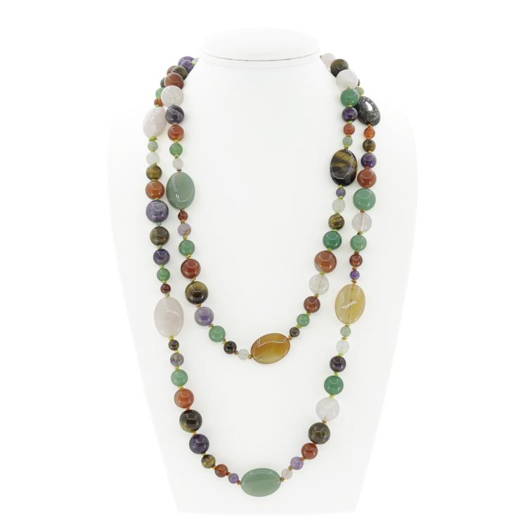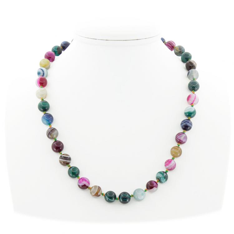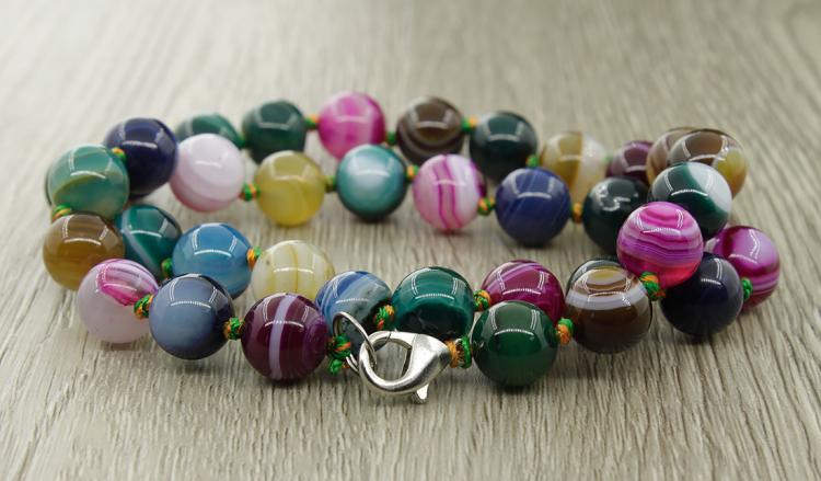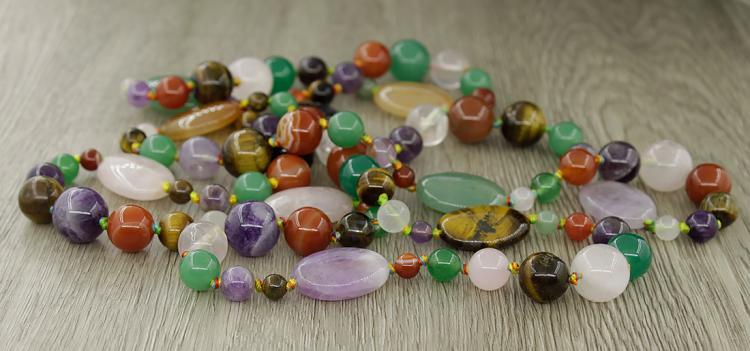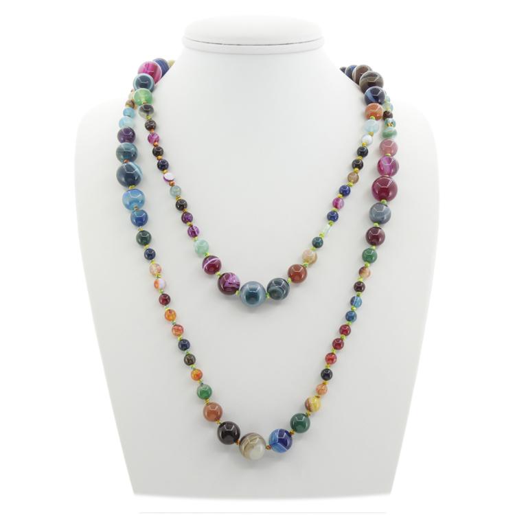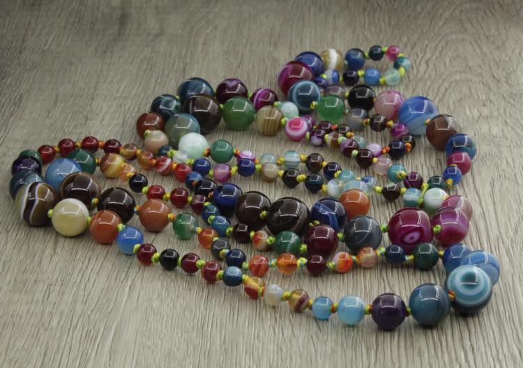 Яркие и гармоничные бусы из натурального разноцветного агата длиной 150см. В этих бусах удачно подобраны бусинки разных размеров от 6 до 14мм.