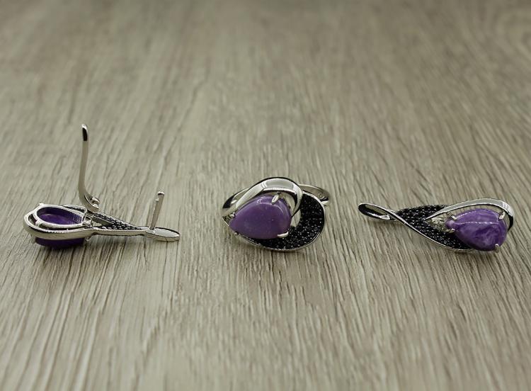Манящий комплект с натуральным чароитом и качественным покрытием. Размер камня в серьге: 8x12мм, размер серьги с застежкой: 30мм. Размер камня в кольце: 8x12мм.