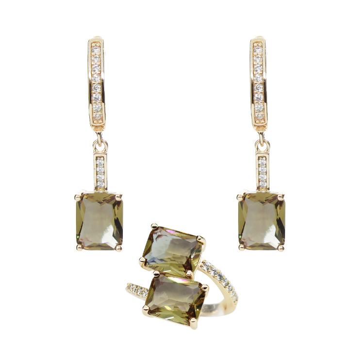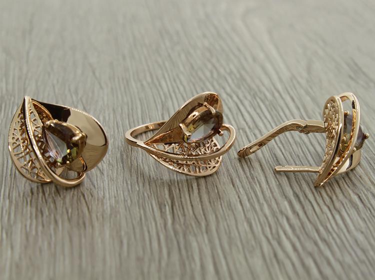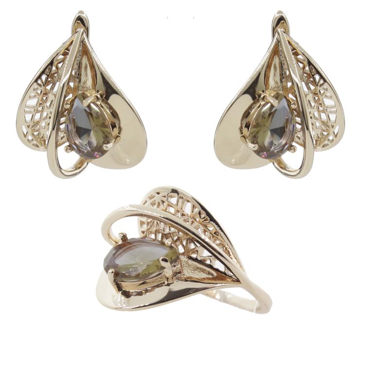 Воздушный комплект со вставкой из султанита и качественным покрытием. Размер камня в серьге и кольце 7х10мм. Размер серьги 19х23мм. Размер кольца 17,5х18,5мм. Комплект находится на удаленном складе (отгрузка на 2 дня позже).