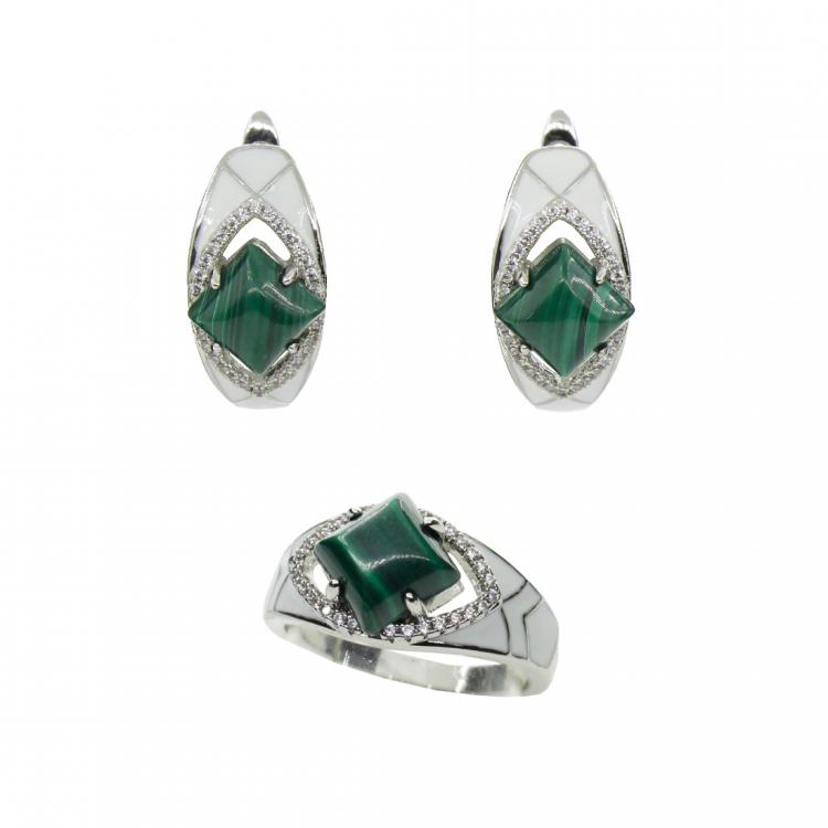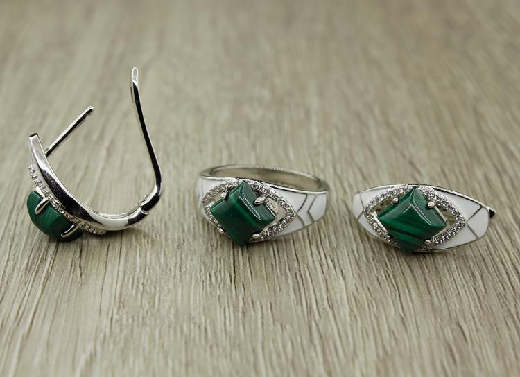 Стильный комплект с натуральным малахитом и качественным покрытием. Размер камня в серьге: 8x8мм, размер серьги с застежкой: 23мм. Размер камня в кольце: 8x8мм