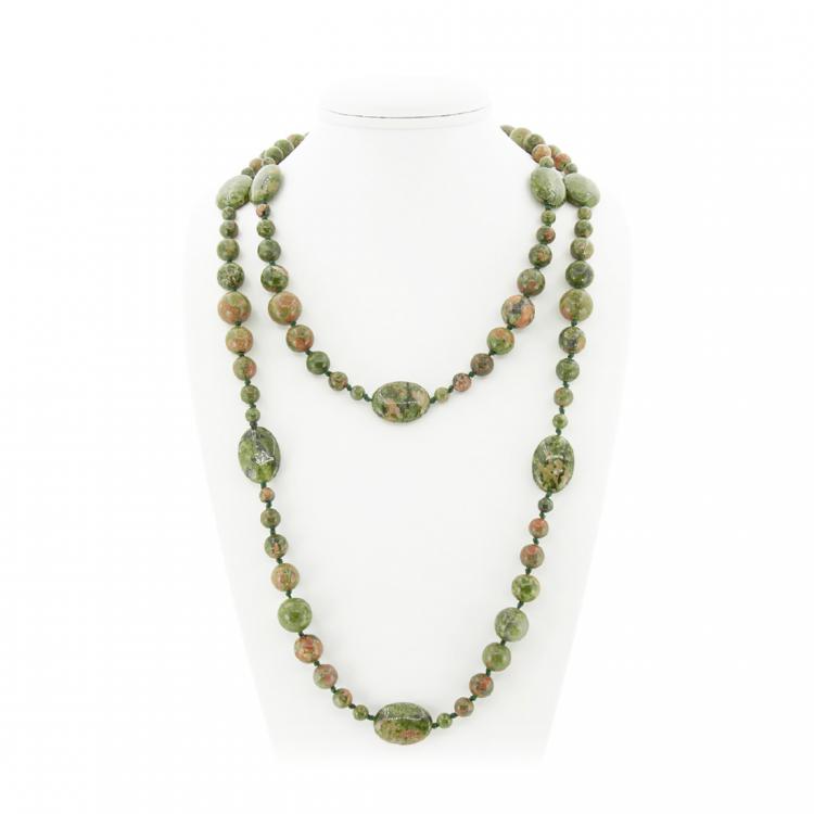 Запоминающиеся бусы из натурального унакита дополнят яркими красками Ваш повседневный или праздничный образ. Длина бус позволяет носить их в два яруса или завязать узлом. Диаметр круглых бусин от 6мм до 14мм, плоских овальных 18х25мм. Длина бус 138см.