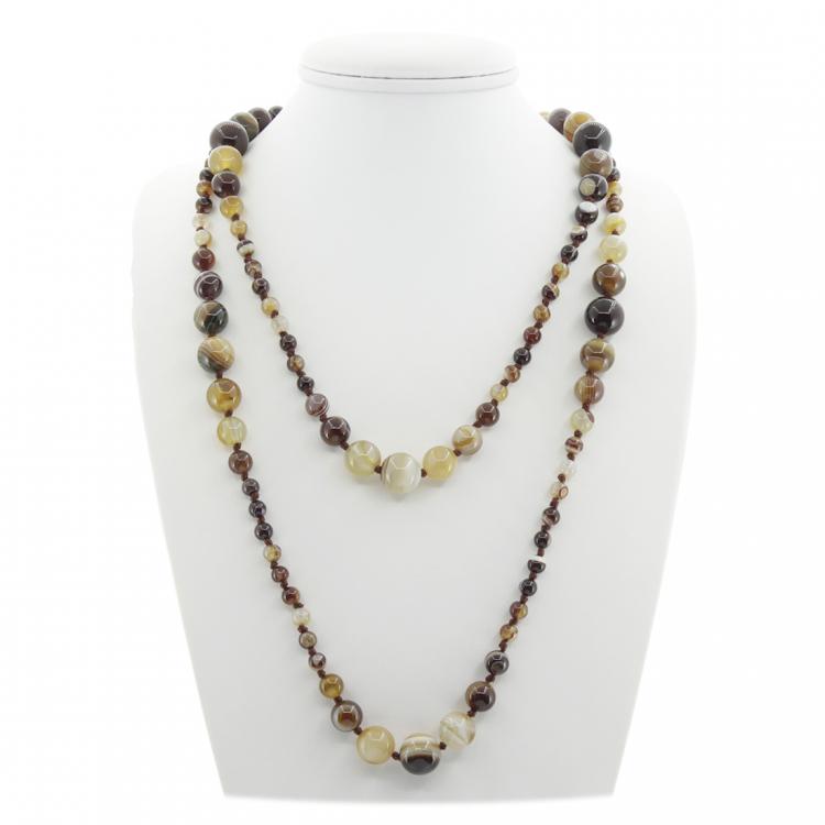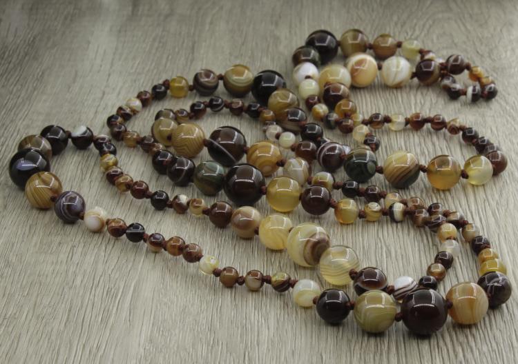 Яркие и гармоничные бусы из натурального коричневого агата длиной 150см. В этих бусах удачно подобраны бусинки разных размеров от 6 до 14мм.
