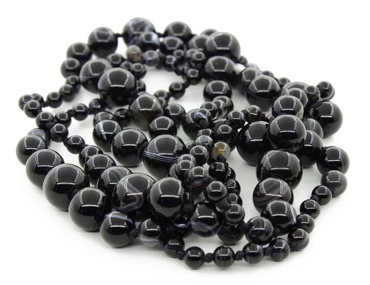 Яркие и гармоничные бусы из натурального чёрного агата длиной 150см. В этих бусах удачно подобраны бусинки разных размеров от 6 до 14мм.