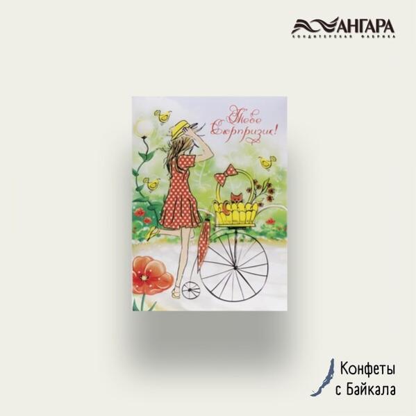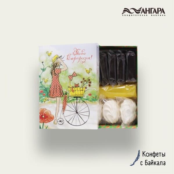 Шоколадные конфеты 418 гр: Ангара Р, Байкальский ключик, Нерпёнок, Байкальский вечер, Байкальский одуванчик, Ангара Л, Лимон-Ангара, Байкальский мак, Байкальская ночка, Барханы пустыни, Байкальский звездопад, Смородиновые, Яблочные, Малиновые, Вишнёвые, Мармелад в шоколаде, Халва подсолнечная в шоколаде, Халва арахисовая в шоколаде, Птичка лесная со вкусом лимона, Птичка лесная со вкусом сливок, Птичка лесная со вкусом шоколада, Байкальский шарм, Грильяж подсолнечный, Батончик с орехами, Батончик с вафлями.