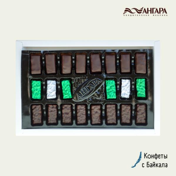 Шоколадные конфеты 563 гр: Ангара Р, Байкальский ключик, Нерпёнок, Байкальский вечер, Ангара Л, Байкальский одуванчик, Байкальский мак, Байкальская ночка, Барханы пустыни, Байкальский звездопад, Байкальская белочка, Смородиновые, Абрикосовые, Яблочные, Вишнёвые, Мармелад в шоколаде, Халва подсолнечная в шоколаде, Халва арахисовая в шоколаде, Птичка лесная со вкусом лимона, Птичка лесная со вкусом сливок, Птичка лесная со вкусом шоколада, Байкальский шарм, Грильяж подсолнечный, Грильяж с арахисом, Грильяж кунжутный, Батончик с орехами, Батончик с вафлями, Клюква с мёдом, Клюква в желе.