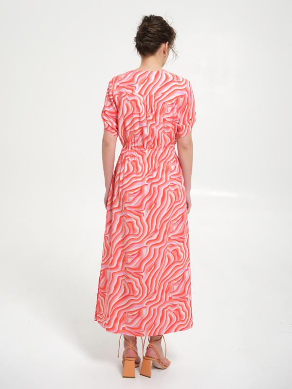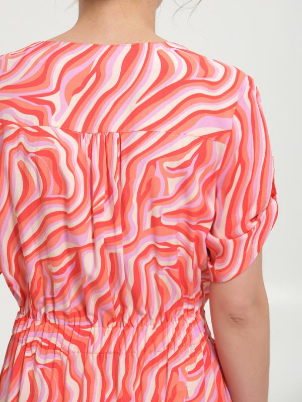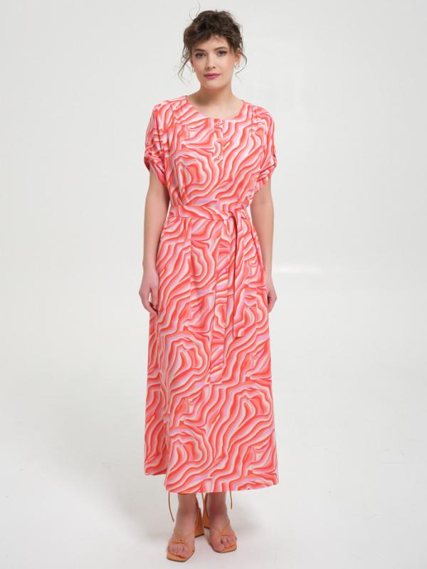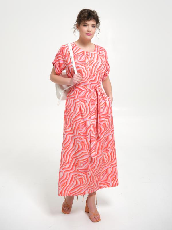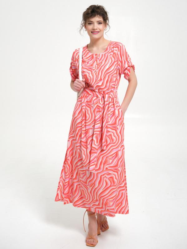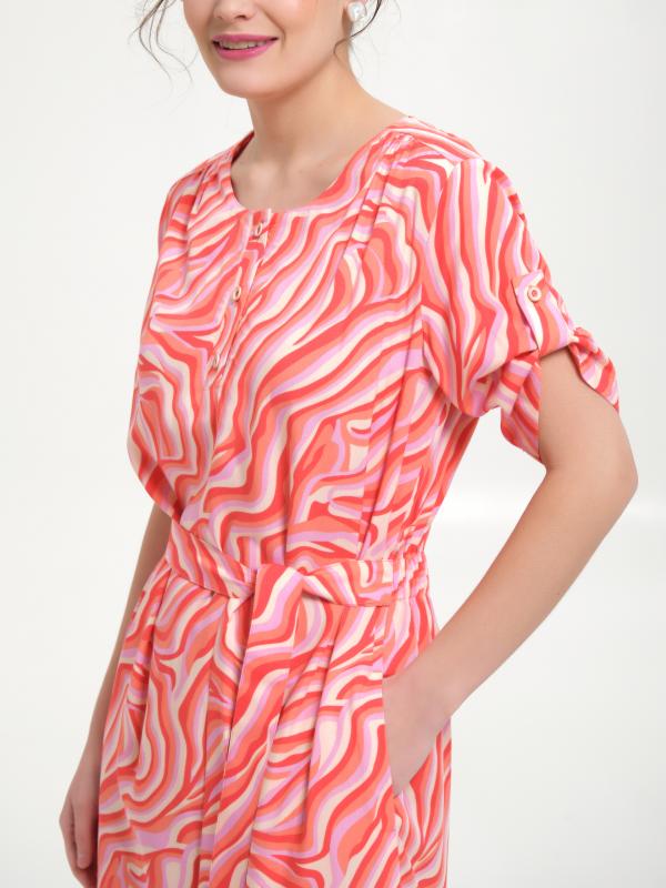 Платье с разрезами по бокам. Модель А-образного силуэта. Спинка с кокеткой, переходящей на перед. Под кокеткой спереди и сзади сборка. В верхней части переда планка с застёжкой на петли и пуговицы. Сзади по талии обработана кулиса с резиной. Спереди талия подчёркнута завязывающимся полупоясом. В боковых швах карманы и высокие разрезы. По низу рукава пата с застёжкой на пуговицу. Торговая марка: Stilla