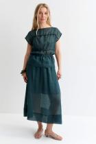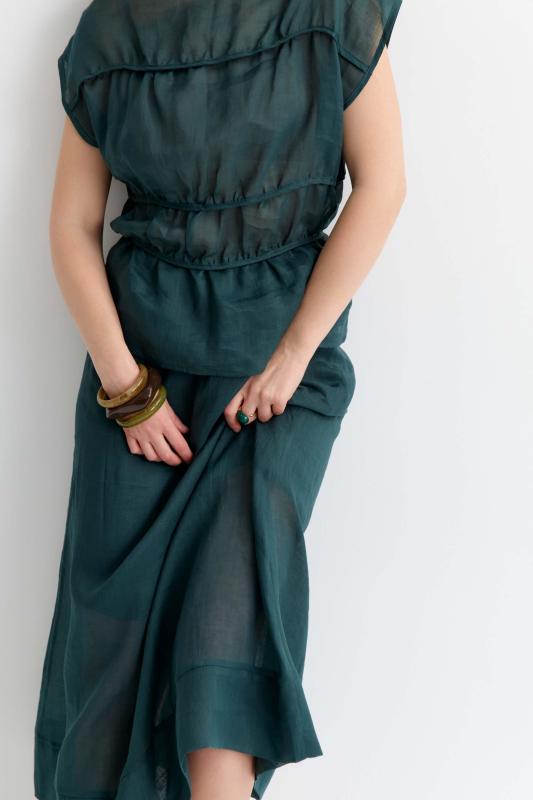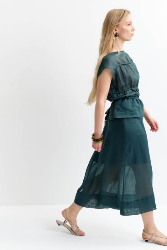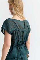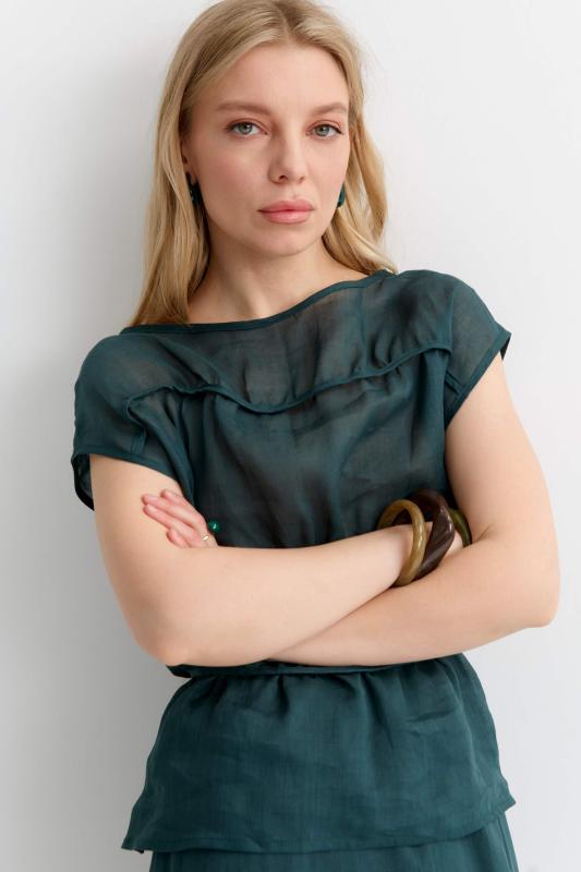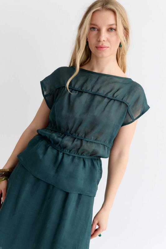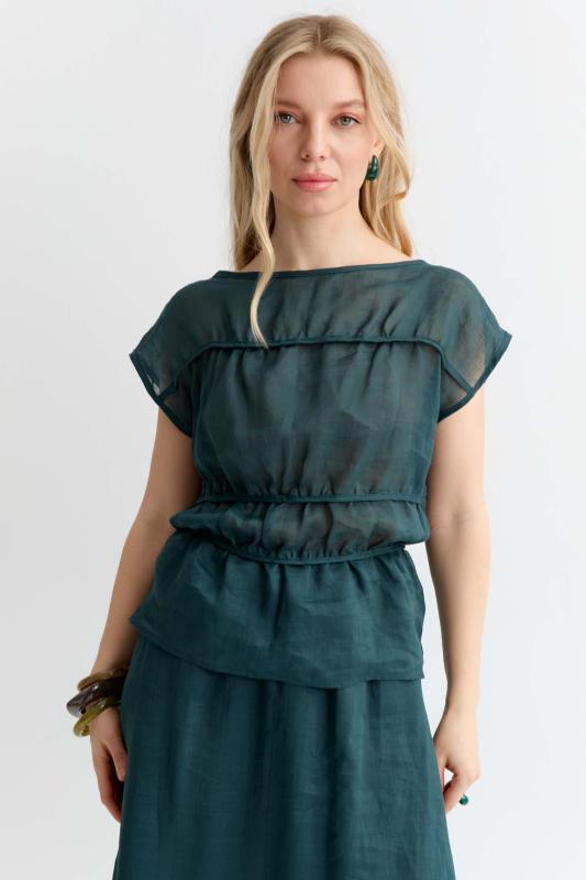 Комфортная блуза из 100% крапивы премиум качества. Свободный топ со спущенной линией плеча, с декоративными горизонтальными сборками обработанные окантовкой, вырез лодочка по горловине, на талии узкие завязки в боковых швах.